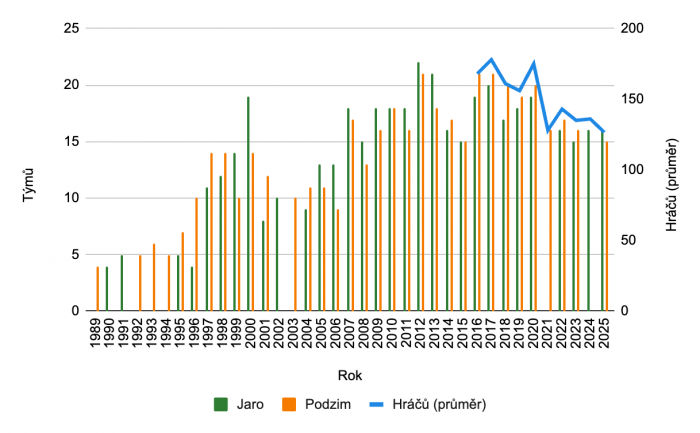 Komunita kolem ufobalu má za sebou příběh, který dobře známe i z jiných amatérských sportů: od nadšených začátků přes dlouhé období růstu až po zlom a hledání nového rytmu. Když se podíváme na vývoj počtu týmů a průměrného počtu hráčů za rok, vykreslí se před námi tři linie: nejprve opatrné krůčky a organický rozmach, poté „zlaté roky“ spojené se silným zájmem a nakonec poslední dekáda, v níž se křivka láme a klesá níž než dřív. Do toho vstoupil také covid, který přerušil návyky, rozvolnil soupisky a posunul turnaje v žebříčku priorit hráčů níže. Ale bylo by příliš jednoduché svalit vše právě na pandemii. Dnes se mnohem zřetelněji ukazuje hlubší trend: komunita ufobalistů stárne a přísun mladých hráčů je pomalý.